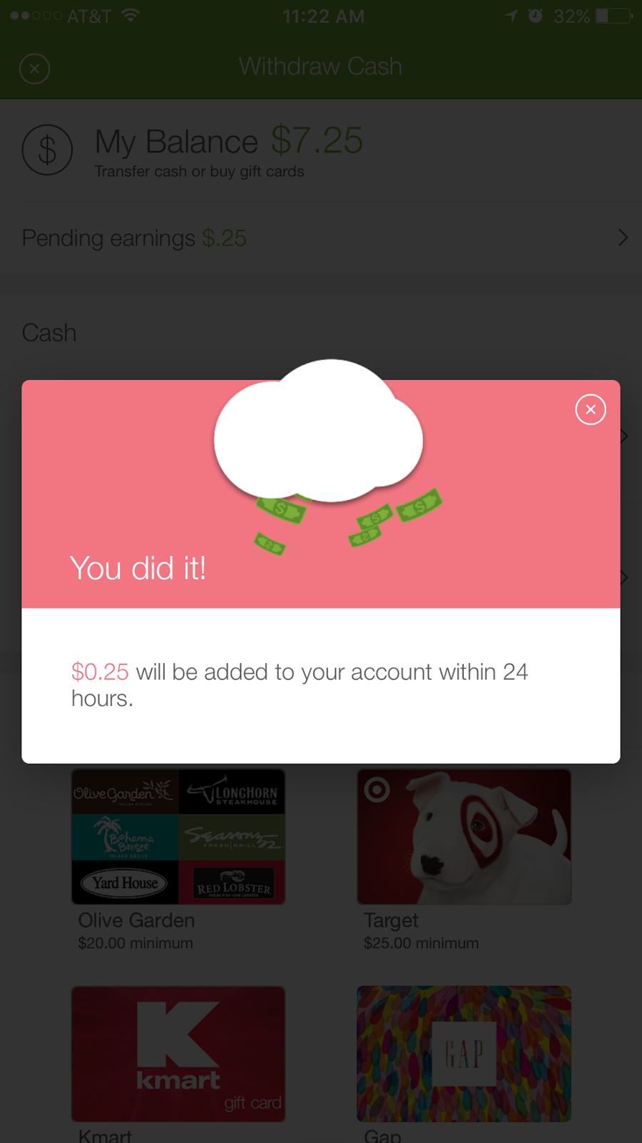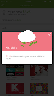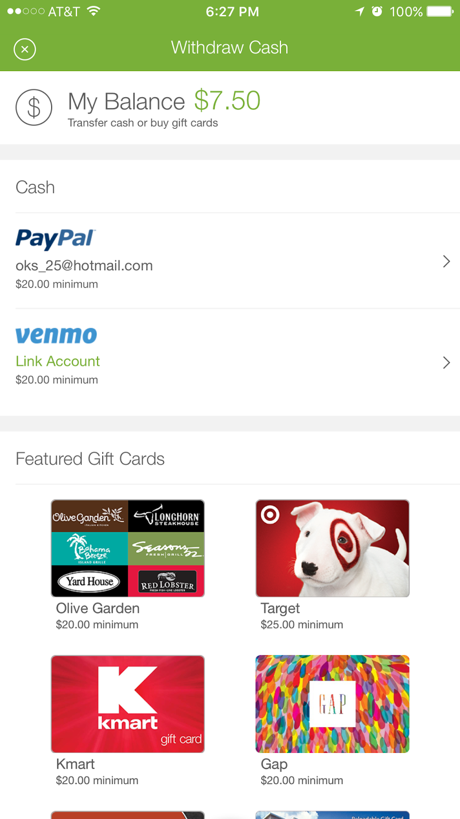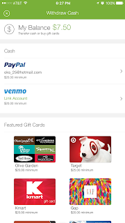 6. Cash back is put in your Ibotta account and can be redeemed once minimum of $20 is accumulated as cash (via Paypal or Venmo) or select gift cards (all not shown here).
