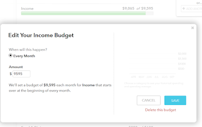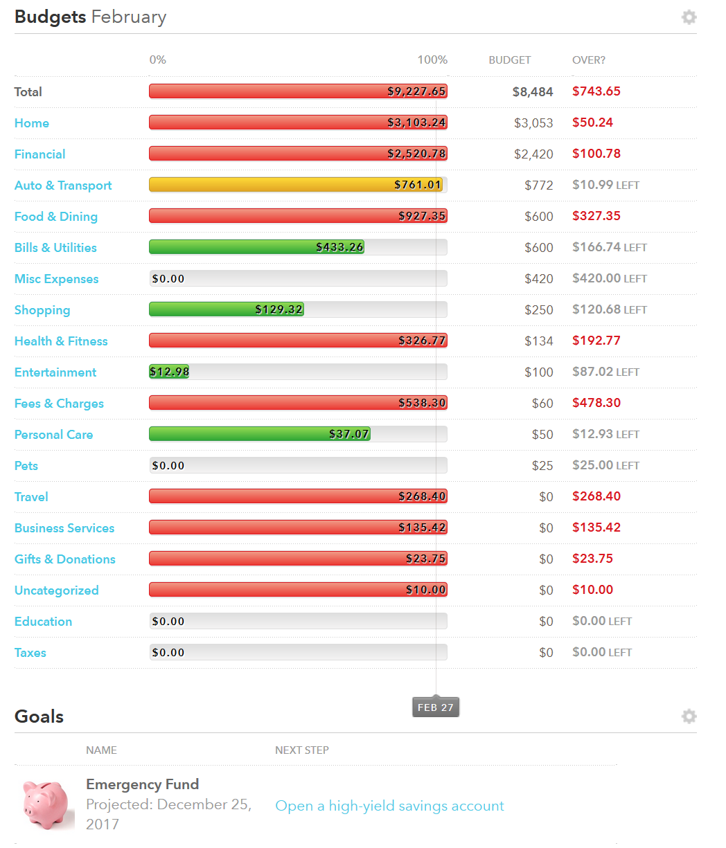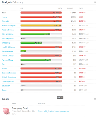 Part of knowing where our money is going is by setting up a budget, and if we are in debt, you need a budget as debt is indication that we have no idea how much or where our money is going and/or that we show no restraint in terms of our finances.  So a budget is a must!  No budget, no progress, plus we need it in order to find out if there are any shortfalls in us being able to pay down and eliminate most debt, specifically consumer debt.  Being on a budget is like being on a diet because it is restrictive, but we are only restricted by how much money we make.  If our lifestyle exceeds this, then we either need to make more money, cutback, or both.  Once, we have budget in place we will have a better idea of those 3, which we need to do.  In Mint, budgeting and goals are available and we will focus on that here to make our budget.  Your budget will look something like this, preferably with a lot less red and more green and yellow.